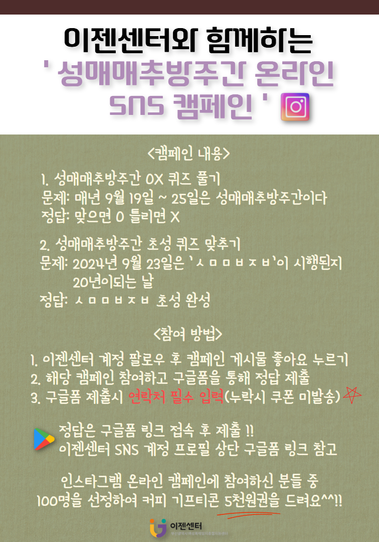 안녕하세요, 이젠센터입니다. 2025년 성매매 추방주간을 맞이하여 시민 참여형 SNS 온라인 캠페인을 실시(9/18)합니다. 일시: 2025.09.18. (목) ~ 09.25.(목) 오후 6시까지 참여 방식: 캠페인 게시물 확인 후 구글 폼으로 답변 제출 완료 당첨자: 캠페인 참여 100명 선정, 커피 기프티콘 5천원권 증정 당첨 안내: 2025.09.29(월) ~ 09.30.(화) 개별 안내 및 쿠폰 발송 구글폼 링크: 이젠센터 계정 프로필 상단 이벤트 링크 확인 주의 사항: 구글 폼을 통해 9/25(목) 오후 6시까지 답변 제출한 분에 한함 *구글 폼 제출시 연락처 누락시 쿠폰 미발송 참고 이젠센터 팔로우 및 게시물 좋아요 등 친구에게 공유하면 당첨 확률 UP-!! 성매매 근절 및 예방을 위한 캠페인으로 시민 여러분의 많은 관심과 참여 부탁드립니다 ^^!! |
