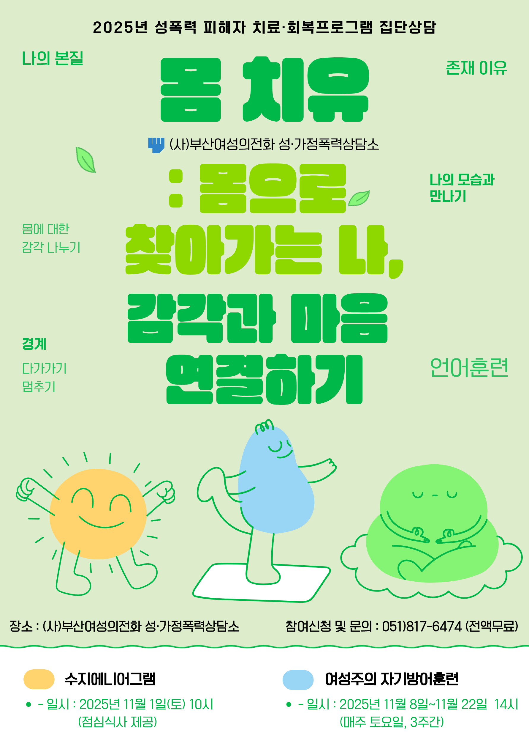 2025년 성폭력 피해자 치료·회복프로그램 집단상담 신청 안내 몸 치유 : 몸으로 찾아가는 나, 감각과 마음 연결하기