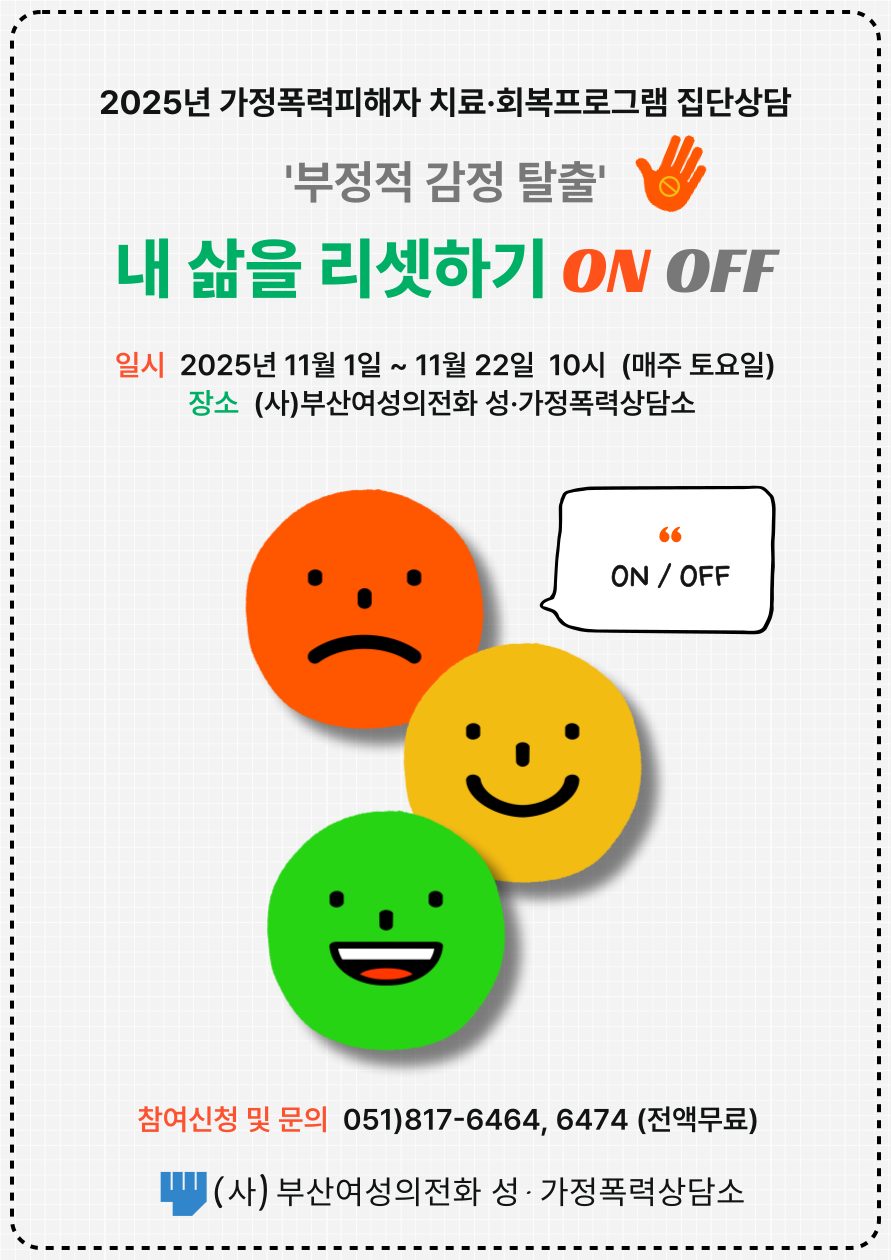 <집단상담 프로그램 일정> - 일시 : 2025년 11월 1일 ~ 11월 22일 10시(매주 토요일, 4주간) - 장소 : (사)부산여성의전화 성·가정폭력상담소 - 참여신청 및 문의 : 051)817-6464, 6474 (전액무료) 참여를 원하실 경우 꼭 연락주시기 바랍니다 :) 많은 관심과 참여 부탁드립니다. |