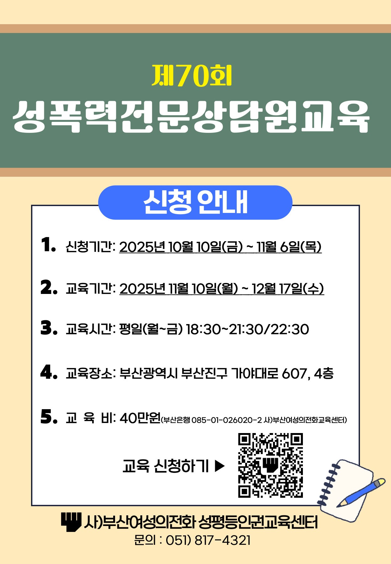 제70회 성폭력전문상담원교육 성폭력 상담활동가 첫걸음을 위한 성폭력전문상담원교육은 성폭력피해자 지원을 위해 성폭력전문상담원을 양성하고, 성폭력에 대한 기본 소양 및 피해자 지원 전문 교육 등 체계적인 훈련 과정을 통해 전문상담원으로서의 역량을 키우는 것을 목표로 합니다. 관심 있는 분들의 많은 참여 부탁드립니다. 사)부산여성의전화 성평등인권교육센터 √ 1999년부터 부산 최초로 시작된 25년간의 교육 운영 경험 √ 많은 교육생을 배출한 신뢰할 수 있는 성평등인권교육센터 √ 성·가정폭력통합상담소 운영을 바탕으로 현장감 있는 강의 √ 충실한 교육 일정, 꼼꼼한 출석 관리 등 인정받는 알찬 교육 √ 현장경험이 풍부한 각 분야 최고의 전문 강사진으로 구성 -안 내- ●신청기간: 2025년 10월 10일(금) ~ 11월 6일(목) ●교육기간: 2025년 11월 10일(월) ~ 12월 17일(수) ●교육시간: 평일(월~금) 18:30~21:30/22:30 총 100시간 ●교육대상: 성평등 및 폭력 예방 교육을 희망하는 누구나 ●교육인원: 30명 내외(교육비 입금 순으로 30명 선착순 마감) *최소 인원 미달 시 교육 일정 변경 및 취소 가능 ●교육내용: 성폭력 기본 소양 및 전문 상담 개입, 대상별 상담, role-play등 ●교 육 비: 40만원(부산은행085-01-026020-2 사)부산여성의전화교육센터) ●교육장소: 부산여성의전화 성평등인권교육센터(부산시 부산진구 가야대로607, 4층) ●신청방법: 구글 설문지 작성 & 교육비 입금 https://forms.gle/HEjCCzDuSRcc6ysN6 ●수료증 발급을 위해 제출해야 할 증빙 자료 →신분증 사본, 실물 증명사진(3×4) 2장(제출하지 않을 시 수료증 발급 불가) →전체 교육 100시간 중 90시간 이상 이수하여야 수료증 발급 가능 ●교육문의: ☎051-817-4321 / E-mail pwhl2001@hanmail.net / FAX 817-4345 ●수강료 환불 규정 -교육 개시 전: 전액 환불 -총 교육 시간의 1/3경과 전: 수강료의2/3해당액 환불 -총 교육 시간의 1/2경과 전: 수강료의1/2해당액 환불 -총 교육 시간의 1/2경과 후: 환불 불가 →부산은행 계좌 외 타행 이체 수수료 제외 후 환불 ※교육 수료만으로 상담원 자격을 갖는 것은 아니며,상담소ㆍ보호시설 상담원에 지원하고자 하는 경우 『성폭력 방지 및 피해자보호 등에 관한 법률 시행령』【별표1】에 따른 개별기준 요건 중 어느 하나를 갖추어야 합니다. 1)「고등교육법」제2조제1호부터 제6호까지의 규정에 따른 학교를 졸업한 사람(이와 같은 수준 이상의 학력이 있는 사람을 포함한다) 2)「사회복지사업법」제11조에 따른 사회복지사의 자격을 취득한 사람 3)「사회복지사업법」제2조제3호 및 제4호에 따른 사회복지법인,사회복지시설 또는 사회복지단체의 임직원으로 성폭력방지 관련 업무에3년 이상 근무한 경력이 있는 사람 4)공무원으로 성폭력방지 관련 업무에3년 이상 근무한 경력이 있는 사람 5)「장애인복지법」제58조에 따른 장애인복지시설 또는 장애인 관련 단체의 임직원으로2년 이상 상담 및 보호업무에 근무한 경력이 있는 사람(장애인을 대상으로 하는 상담원의 경우만 해당한다) |