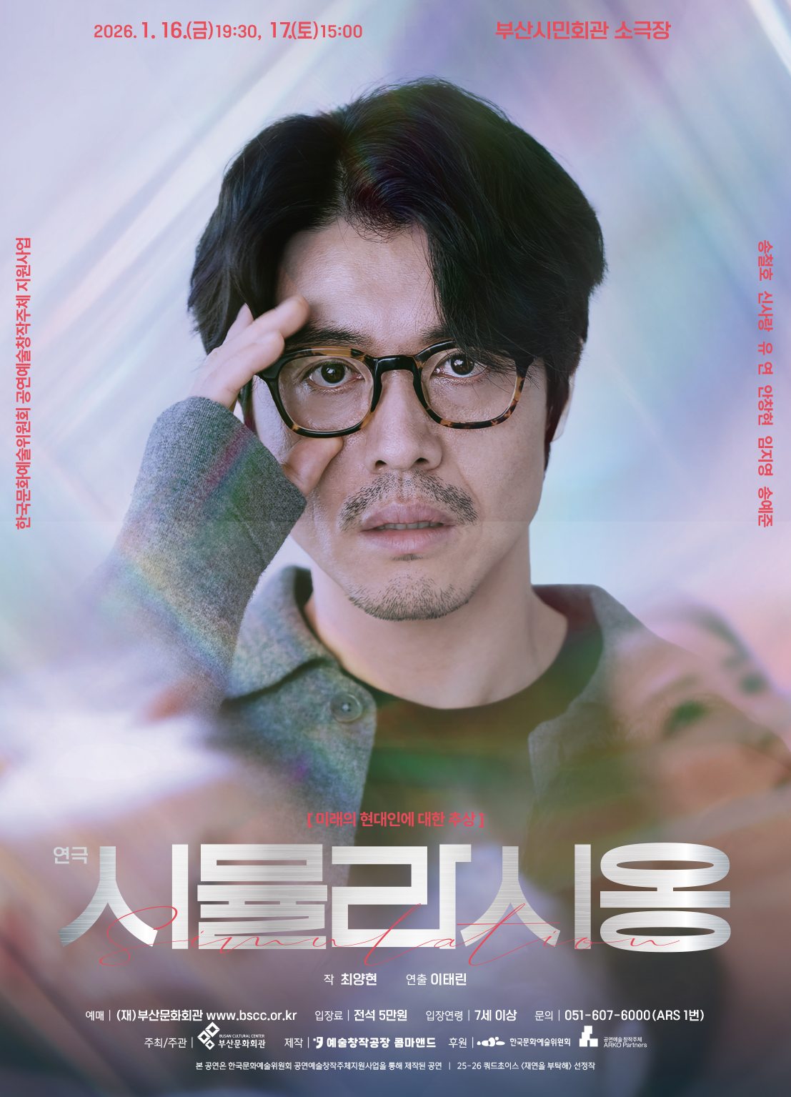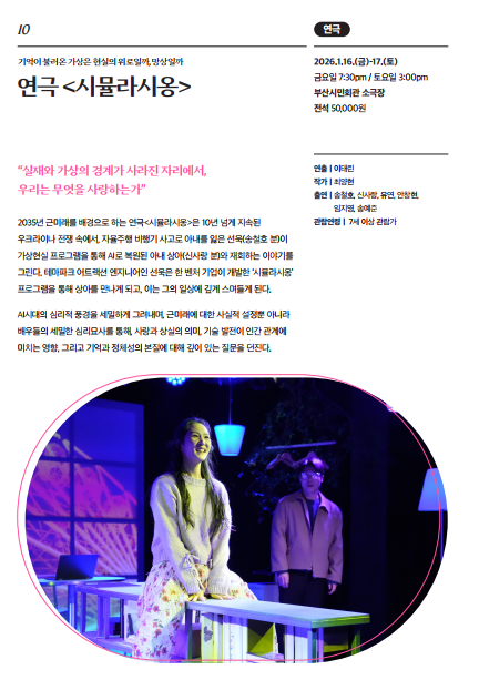 □ 공연개요 ○ 공 연 명 : 연극 &시뮬라시옹& ○ 공연소개 : &날 지금 있는 그대로 봐줬음 좋겠어.& 가상현실 재현 프로그램인 '시뮬라시옹'으로 아내를 되살릴 때까지만 해도 행복했다. 아내의 비밀을 마주하기 전까진. ○ 공연일시 : 2026년 1월 16일(금) 19:30, 1월 17일(토) 15:00 ○ 공연장소 : 부산시민회관 소극장 ○ 관람시간 : 100분(인터미션 없음) ○ 관람연령 : 7세 이상 관람 ○ 할인안내 : 공무원 및 교직원 40% 할인 *공연 당일 사원증 등 증빙 서류 미지참 시 차액 지불